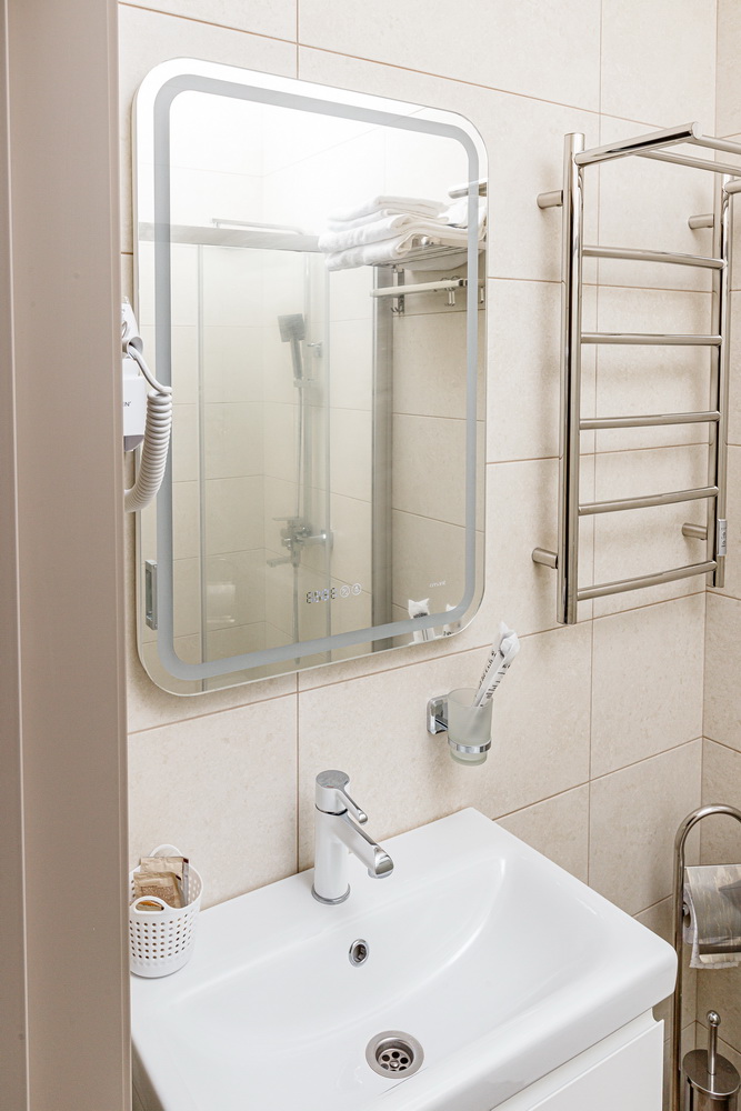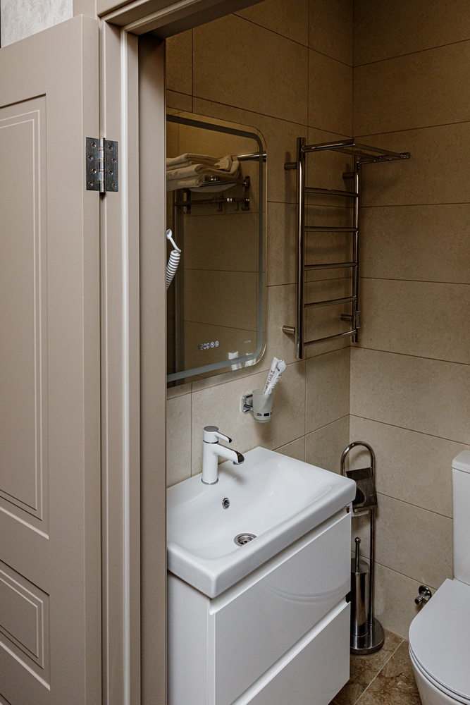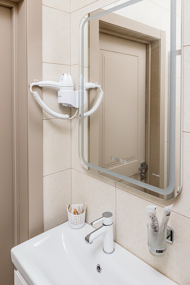 Чтобы вы могли насладиться чашечкой чая в любое удобное время, в номере имеется чайный набор с принадлежностями. Ваш комфорт учитывается в деталях, поэтому в вашем распоряжении собственный санузел с душем. Для вашего удобства предоставляются два полные банных комплекта, включая халаты, тапочки и мягкие полотенца.