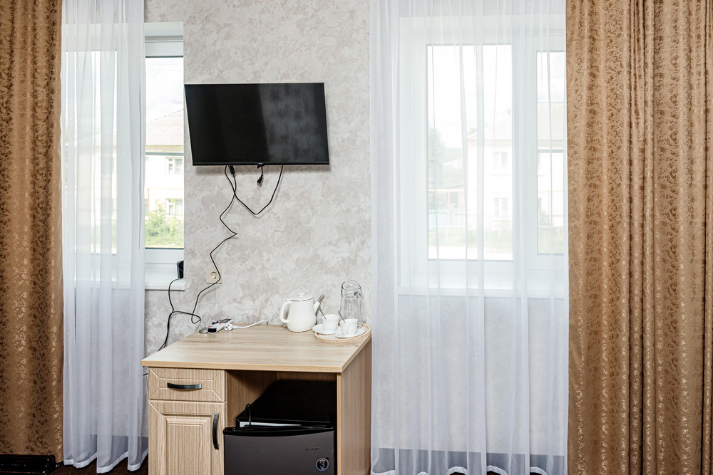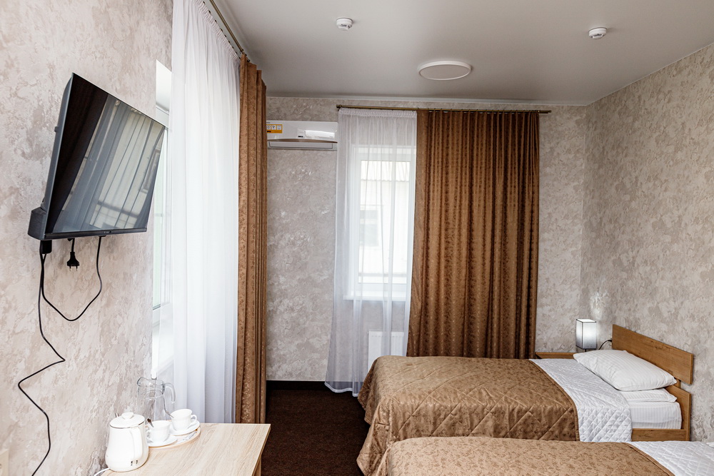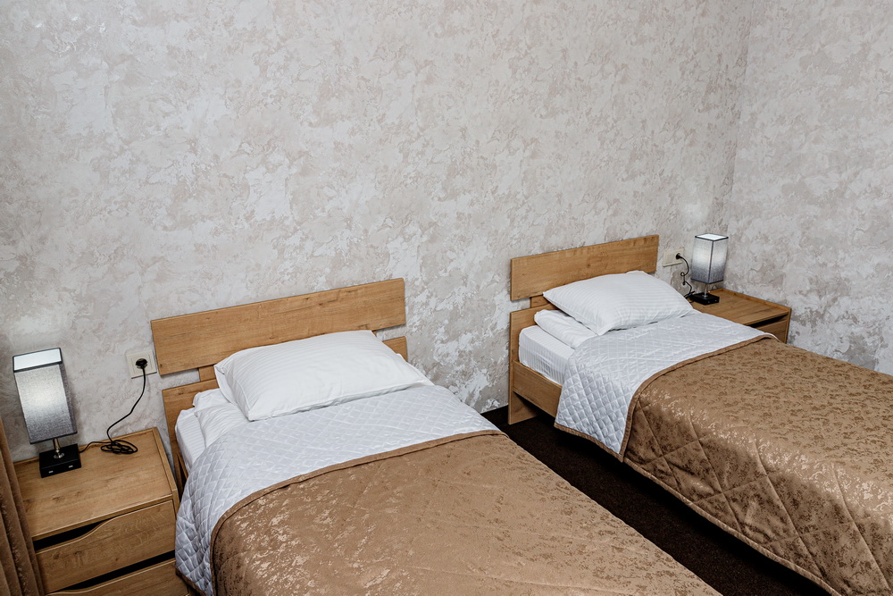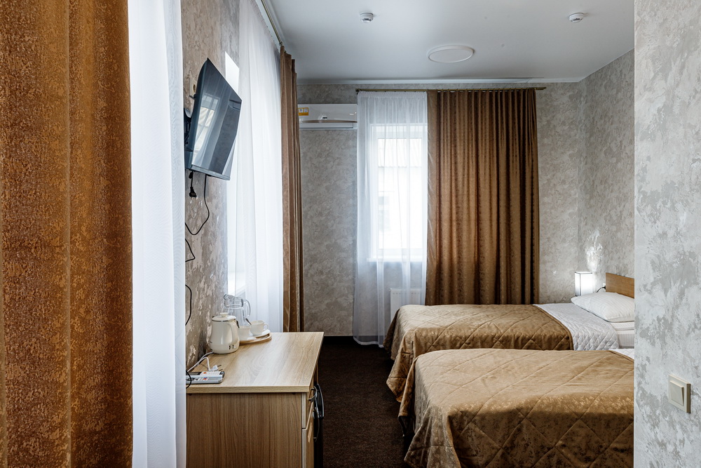 Предлагаем вашему вниманию комфортабельный двухместный номер в уютном отеле "Усадьба" расположенном в живописном районе р.п. Вознесенское в Нижегородской области. Номер оборудован всем необходимым для приятного и расслабляющего отдыха. Вас ждут две удобные односпальные кровати с мягким постельным бельем, телевизор для вашего развлечения, кондиционер для поддержания комфортной температуры, а также бесплатный wi-fi для связи с внешним миром.