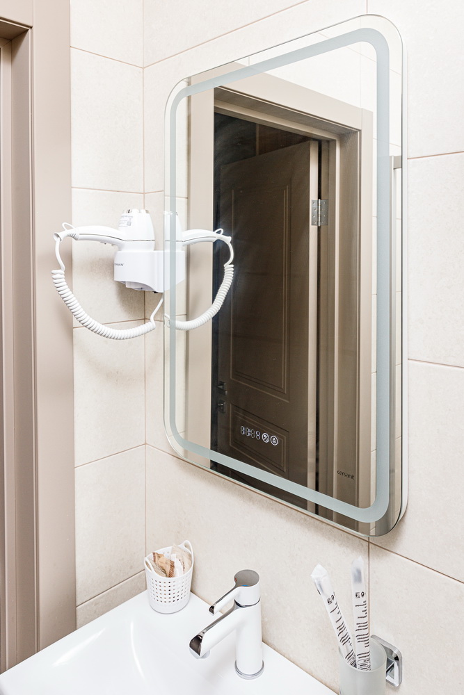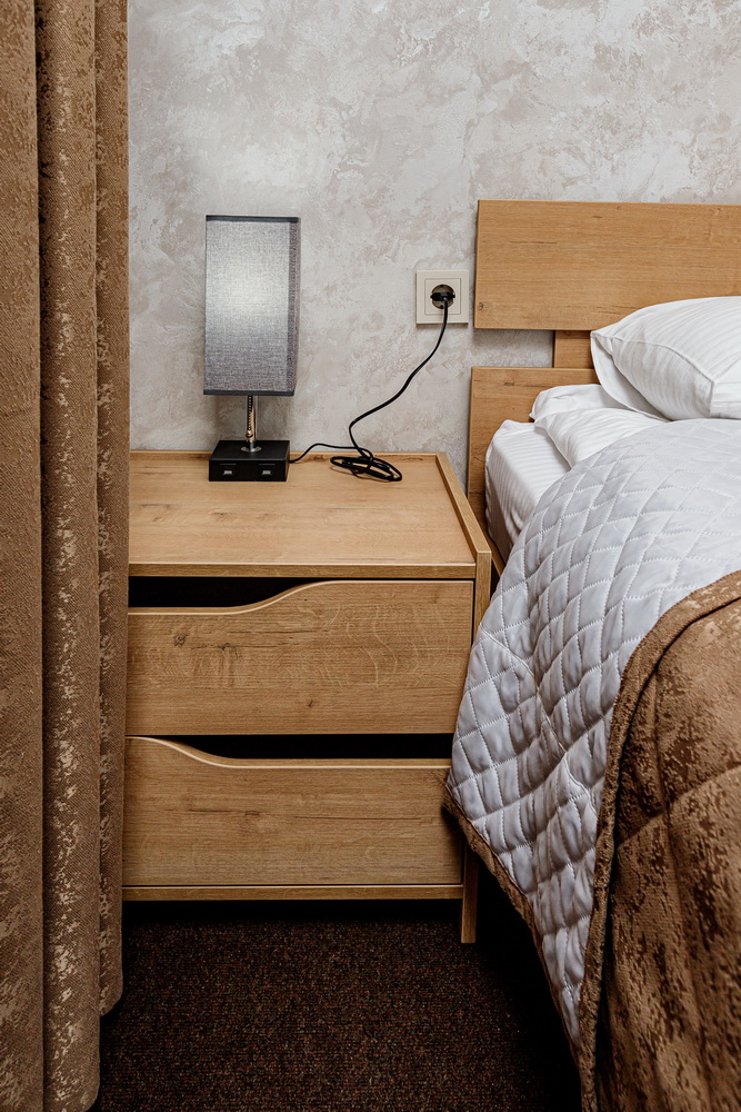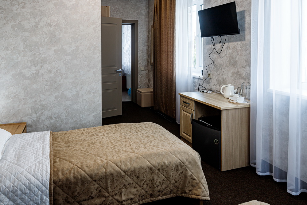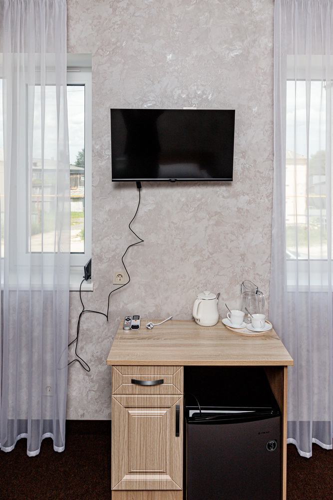 Для вашего удобства в номере имеется мини-холодильник, где вы сможете хранить свежие напитки и закуски. Также вас ждет чайный набор с принадлежностями для приготовления ароматного чая или кофе. В вашем распоряжении уютный санузел с современным оборудованием.