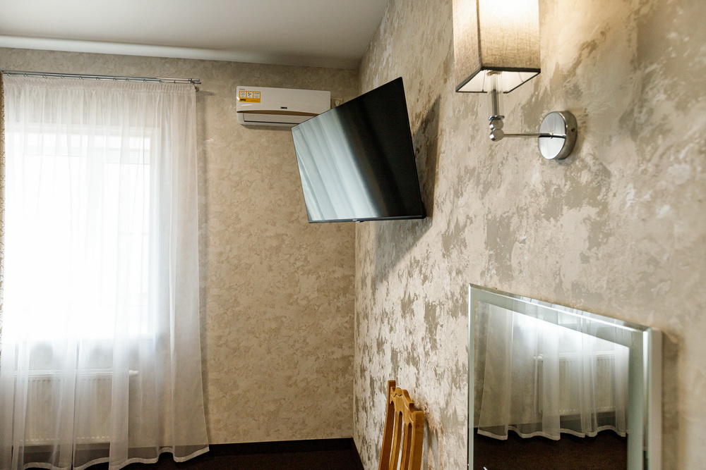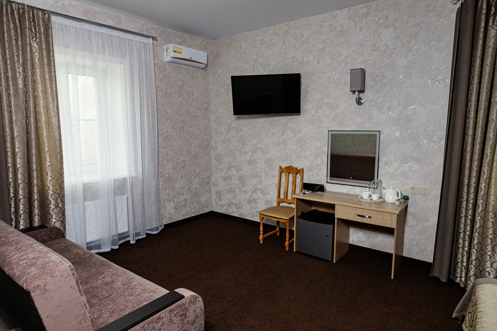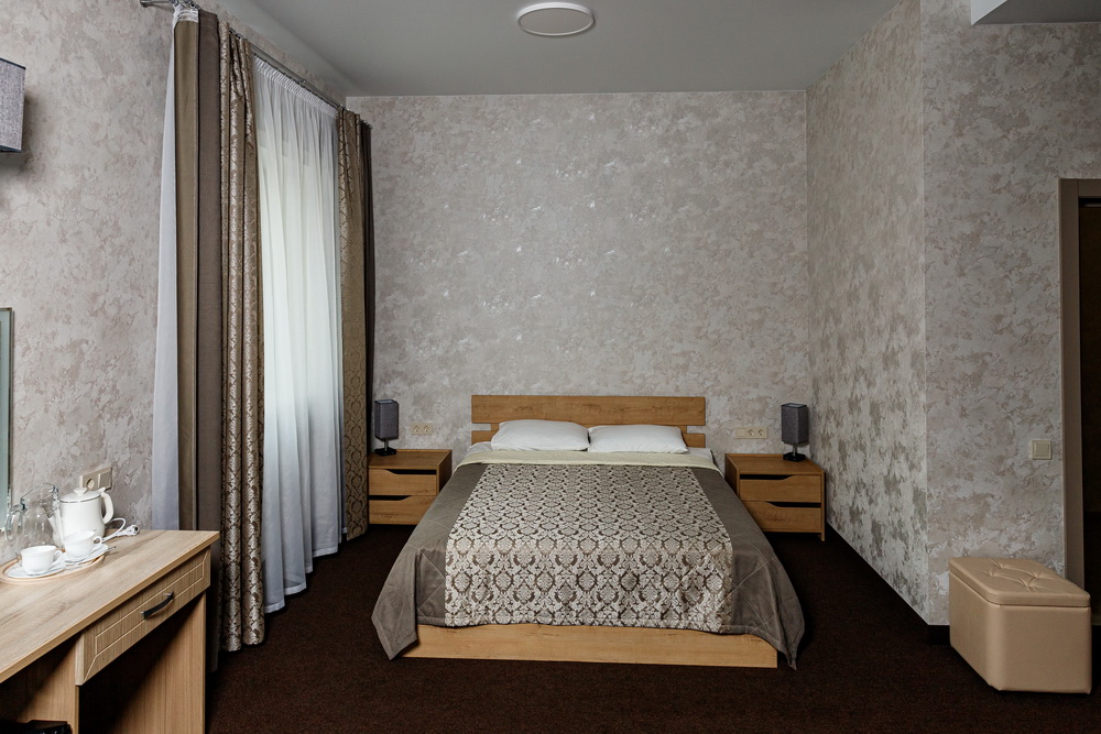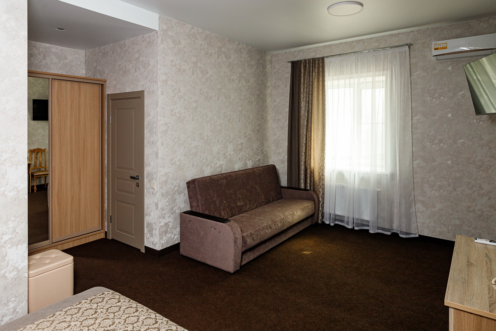 В номере Люкс вас ждет уютная двуспальная кровать, просторный диван и стильный шкаф для удобства хранения. Для вашего развлечения предусмотрен телевизор, а для комфортного пребывания в любую погоду – кондиционер.